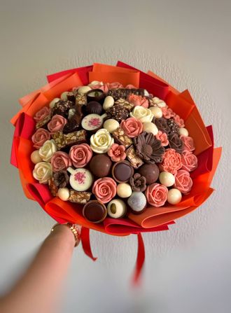 Сладкий букет из шоколадных цветов ручной работы, вкусных конфет и вишни в белом шоколаде.