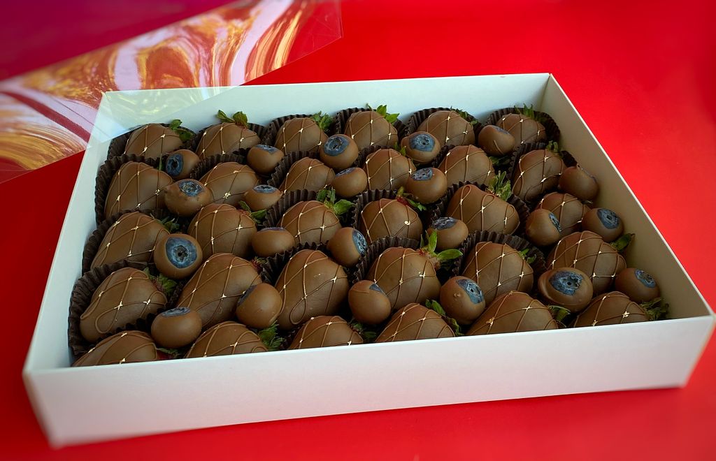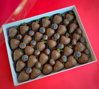 Потрясающая коробочка с клубникой и голубикой в молочном шоколаде.