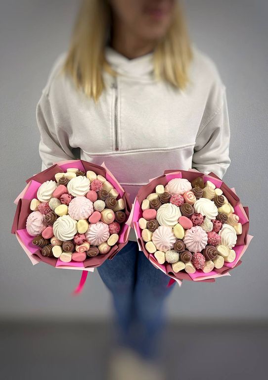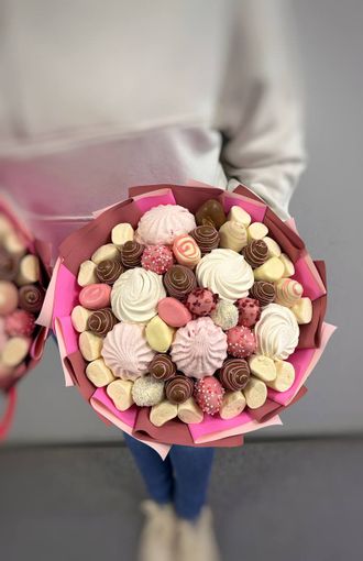 Сладкий букет собран из нежного зефира, маршмэллоу в шоколаде и клубники в шоколаде.