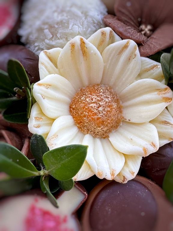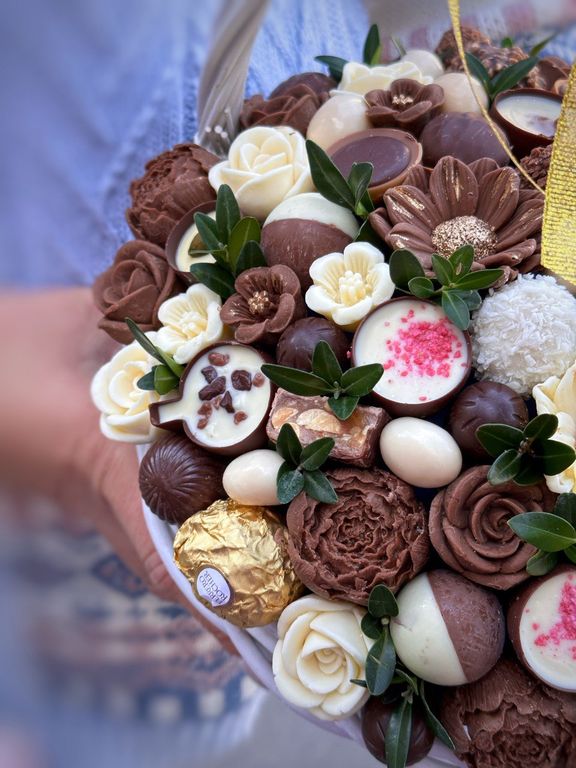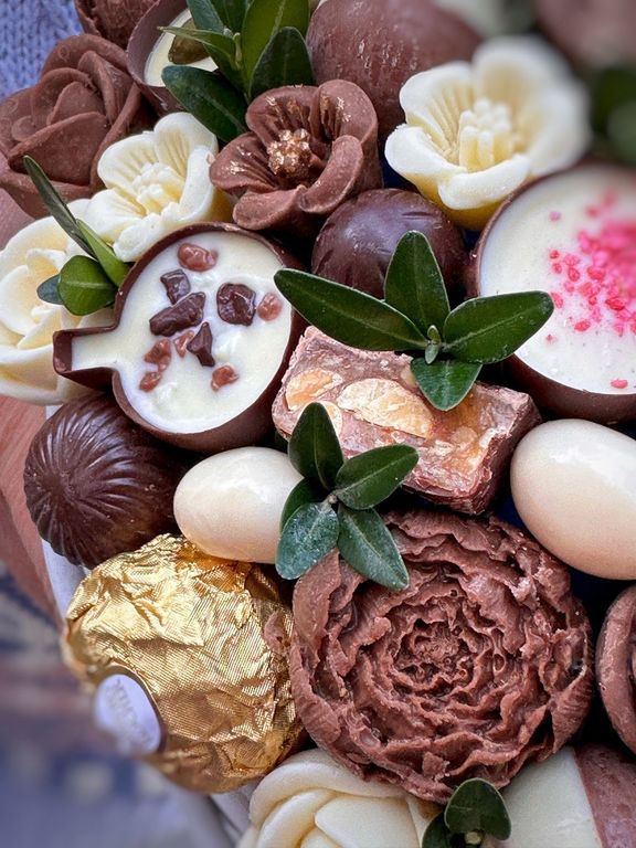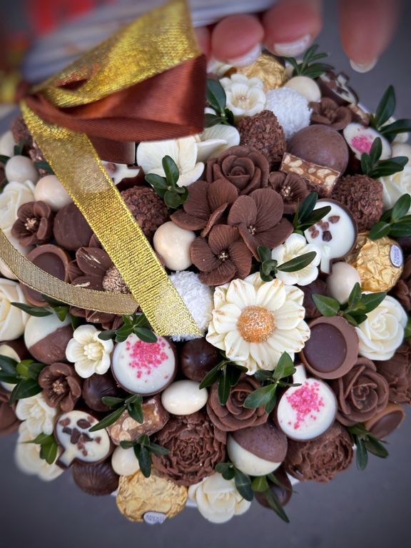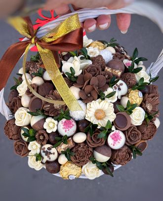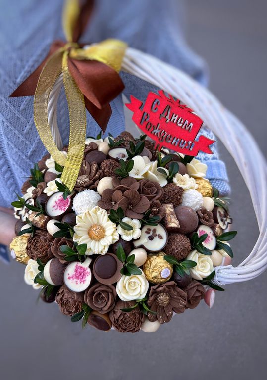 Корзина с вкуснейшими шоколадными конфетами и цветами ручной работы, выполненные из шоколада.
