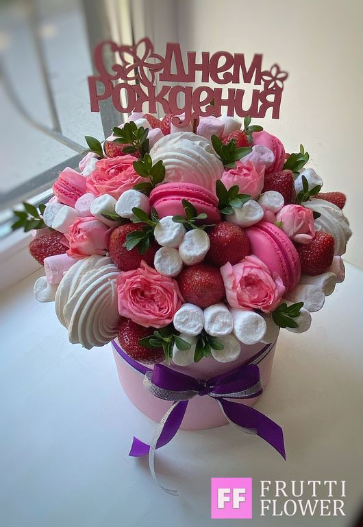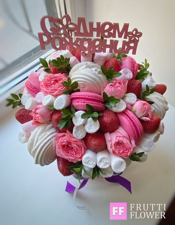 Шикарная копозиция с зефиром, маршмэллоу, макаронсами, клубникой и розочками.