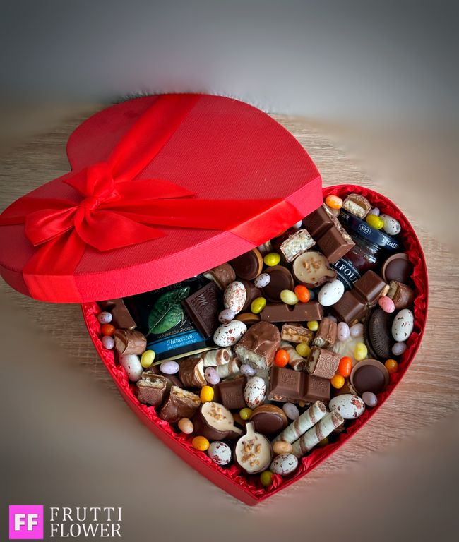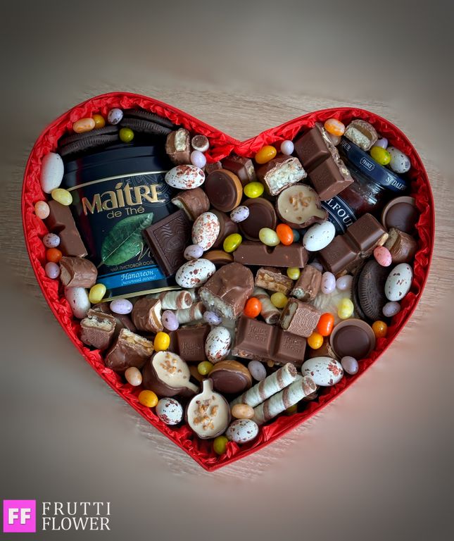 Наполнение: чай зеленый, банка джема, шоколадка Ritter sport с орехами, Toffifee пачка, печенье Oreo mini, Snikers mini, Bounty mini, Twix mini, вафельные трубочки, конфеты Комильфо, зефир, маршмелоу, темный шоколад (маленькая плитка), драже разноцветные.