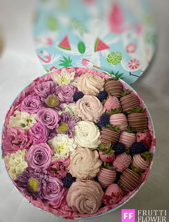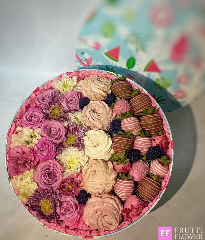 Шикарная коробка с клубникой в шоколаде (2!ряда), нежнейшм зефиром и прекасным цветочным наполнением.