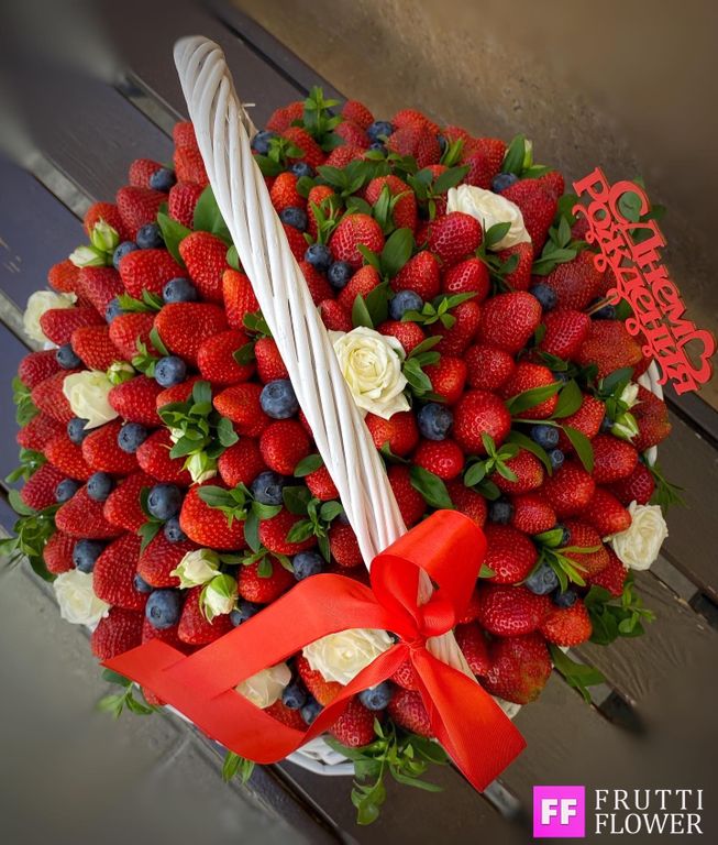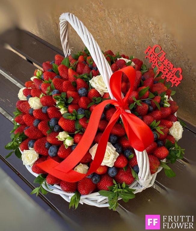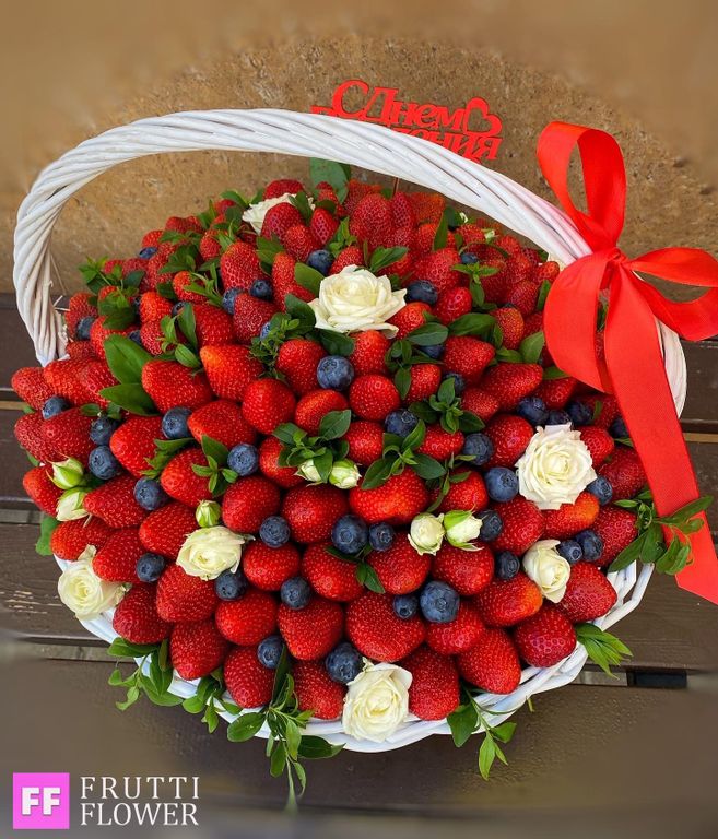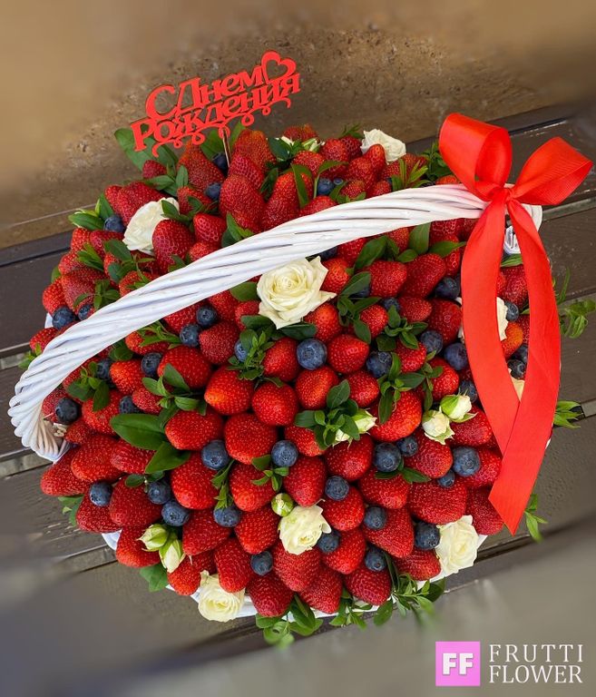 Корзина с клубникой, голубикой и шикарными розами.