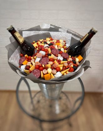 В составе сфрокопченная колбаска, грудинка, куриные копченные колбаски, колбаса фуэт, пиколини, кабаносы сыр твердый, сыр скаморца, сыр камамбер, черри, маслины и две бутылочки пенного.