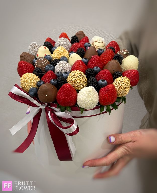 Клубника в шоколаде (белом и молочном), а также свежие ягоды (клубника, голубика, ежевика) создадут Вау-эффект от подарка.