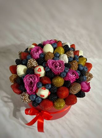 Композиция в шляпной коробке с клубникой, ежевикой, голубикой и ароматными розами.