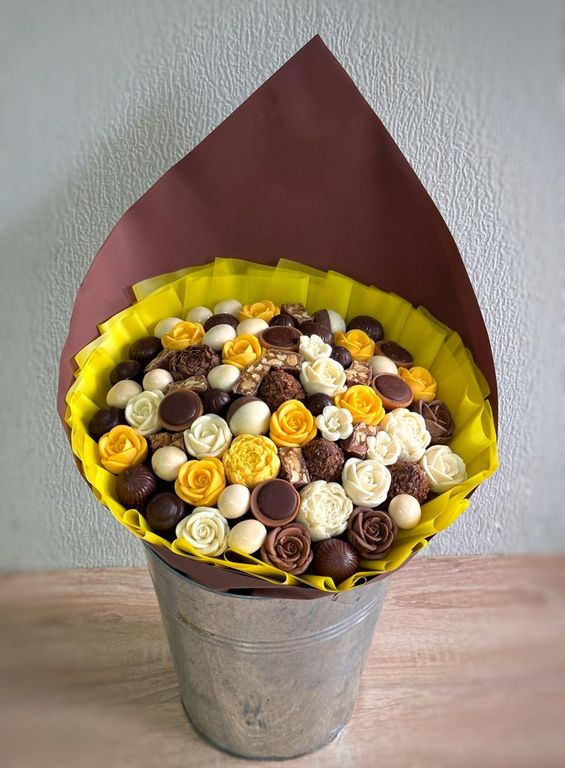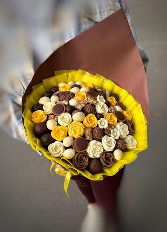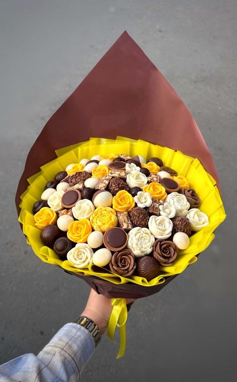 Великолепный сладкий букет из вкусных шоколадных конфет и цветов ручной работы, выполненных из шоколаада.