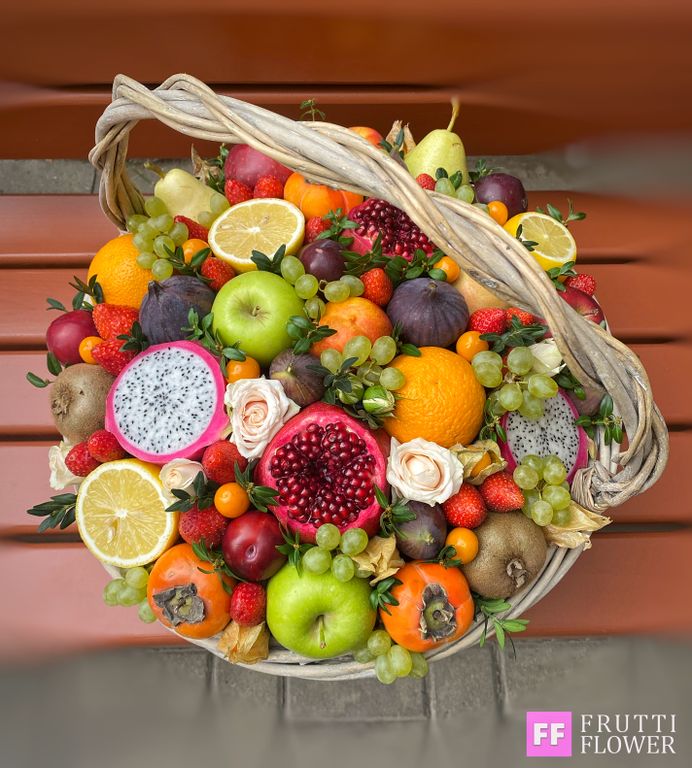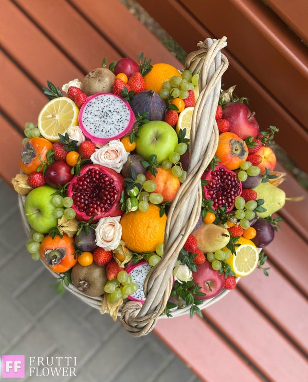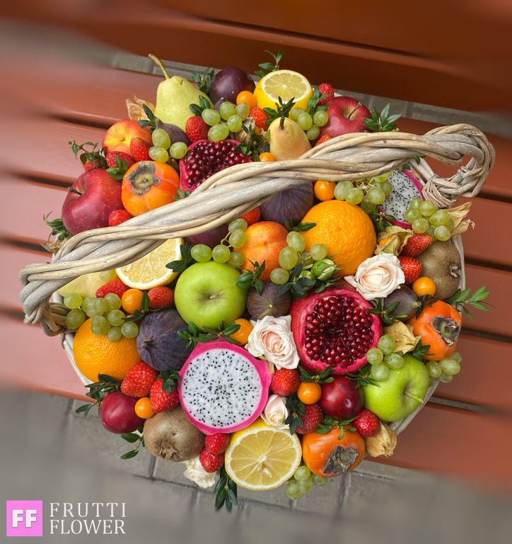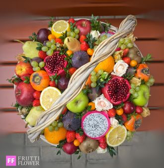 Шикарная корзина с фруктами, ягодами и цветами.