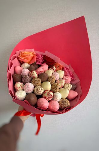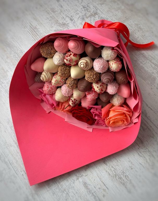Букет из клубники, покрытой белым и молочным шоколалом и розами (5 шт).
