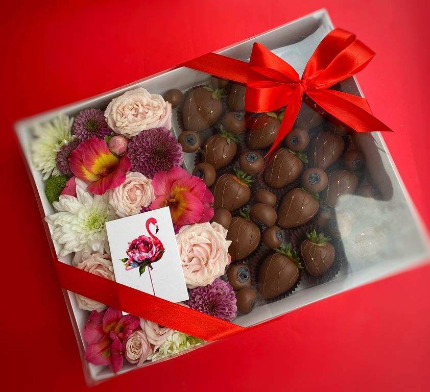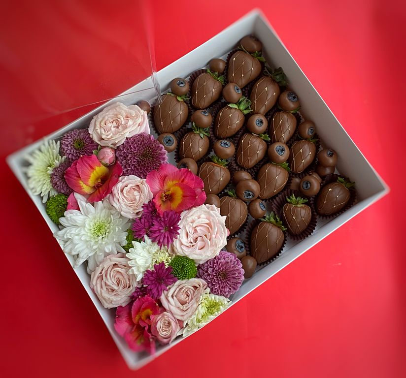 Идеальное сочетание клубники и голубики в шоколаде и цветов.