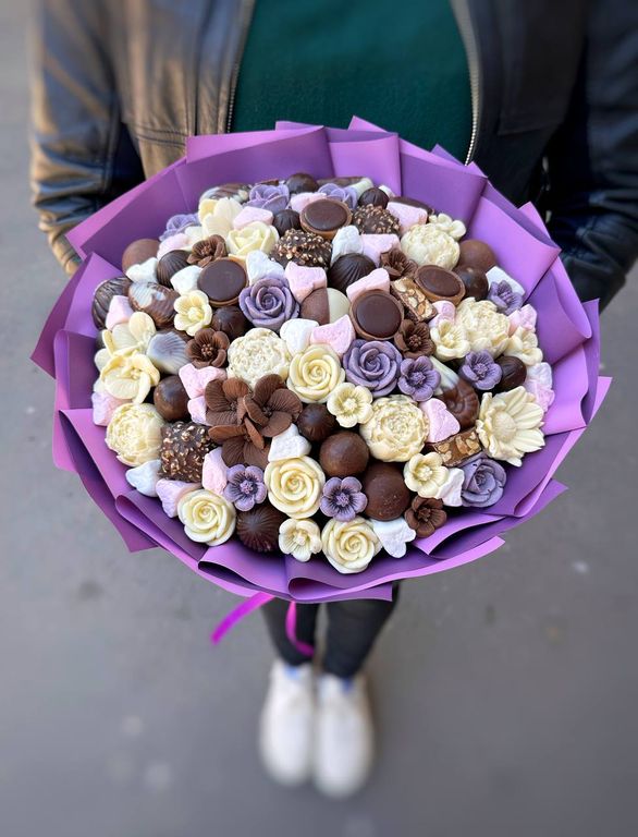 Сладкий букет для истинных сладкоежек из вкусных шоколадных конфет, нежного маршмэллоу и цветов ручной работы , выполненных из шоколада.