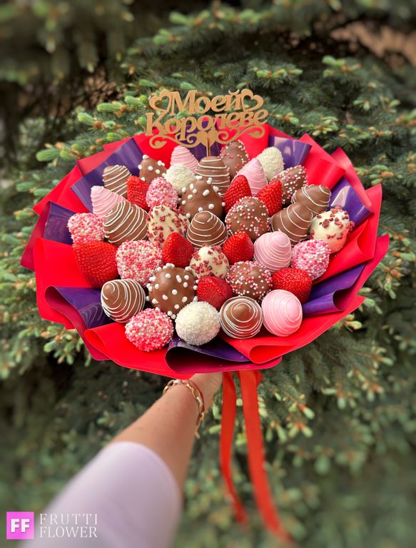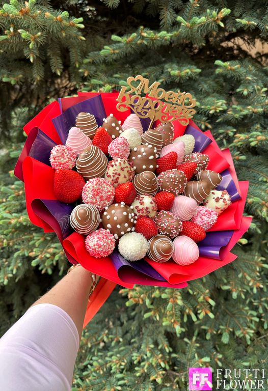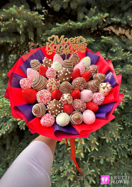 Шикарный букет из свежей клубники и клубники в шоколаде с различным дизайном.