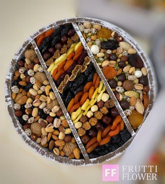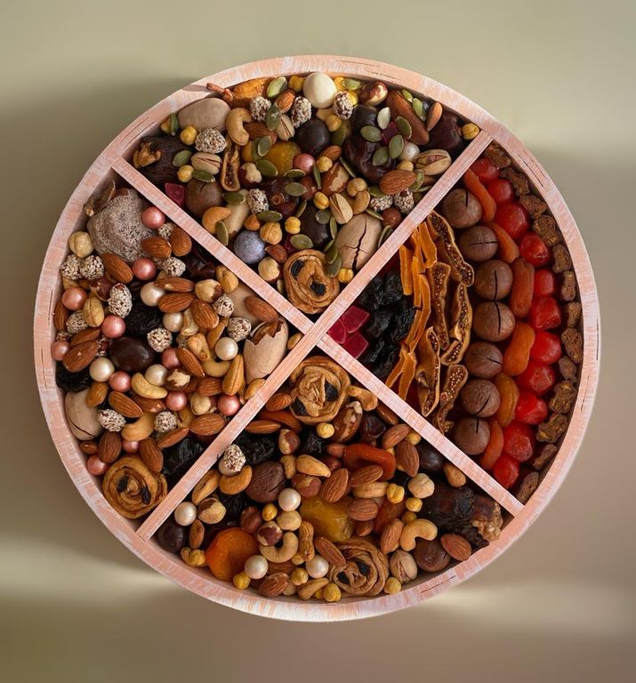 Шикарный деревянный круглый бокс с сухофруктами и орехами.