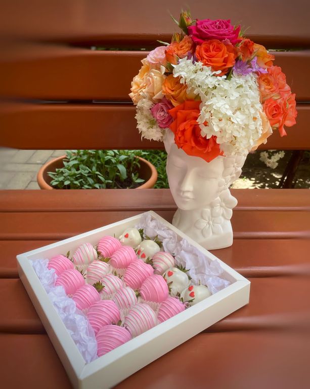 Гипсовый бюст с цветами + коробочка с клубникой (20шт).