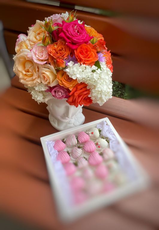 Великолепные композиции с цветами, дополненные клубникой в шоколаде.