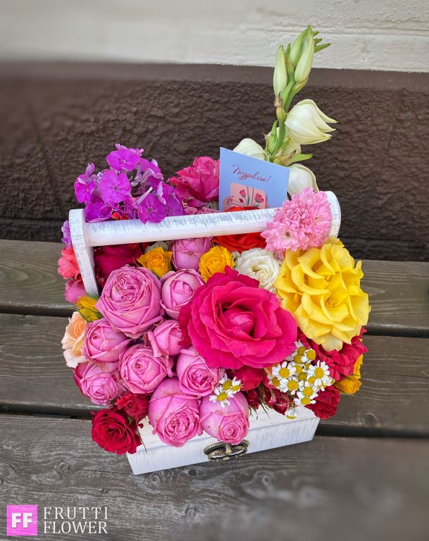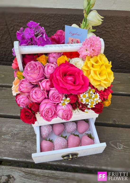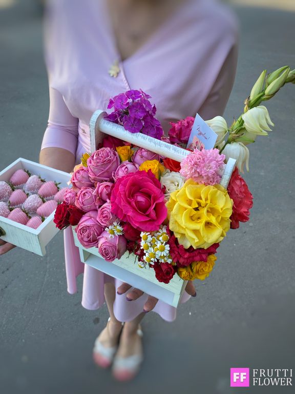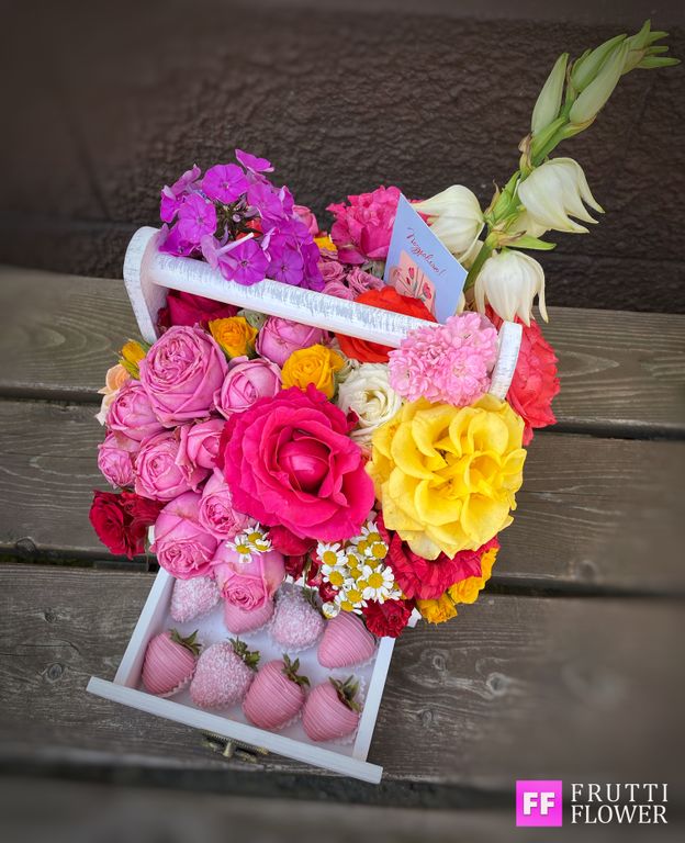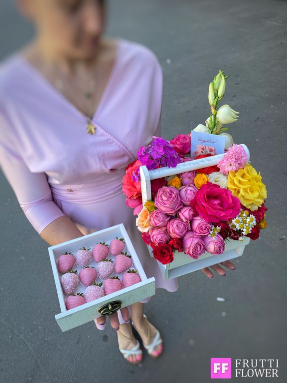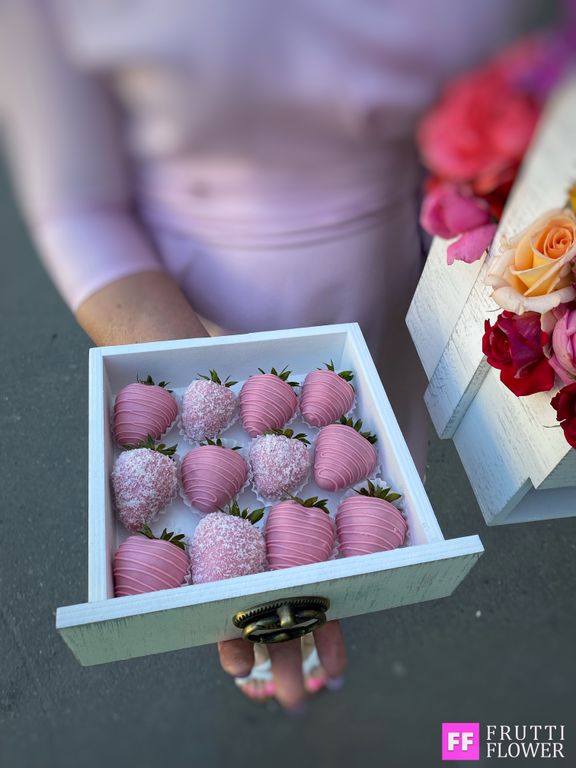 Шикарнейшая композиция с великолепным цветочным наполнением и клубничкой в шоколаде (12 шт.).