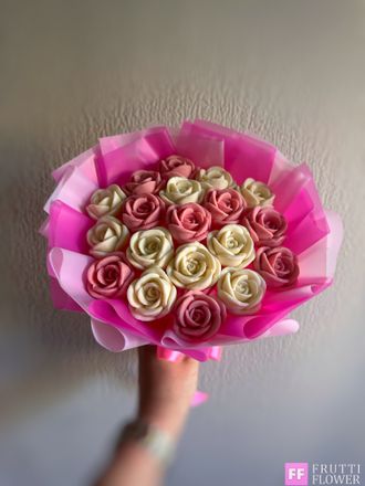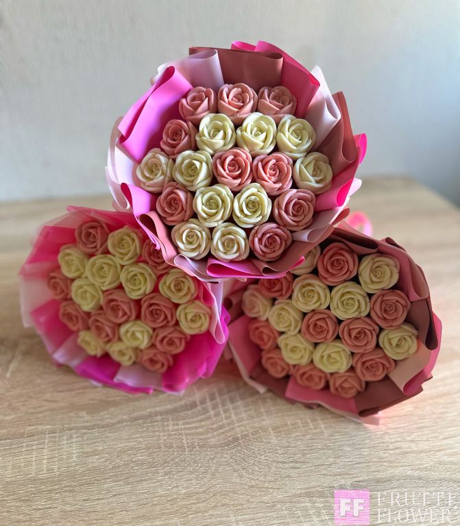 Нежный букет из шоколадных розочек, выполненных из профессионального шоколада итальянского производства.