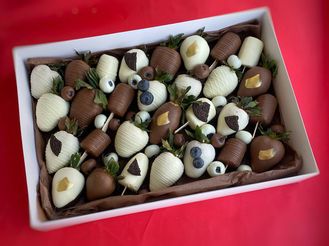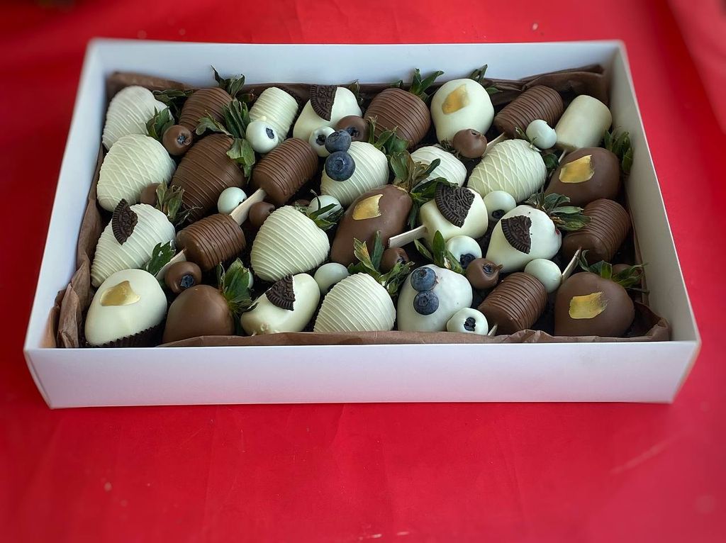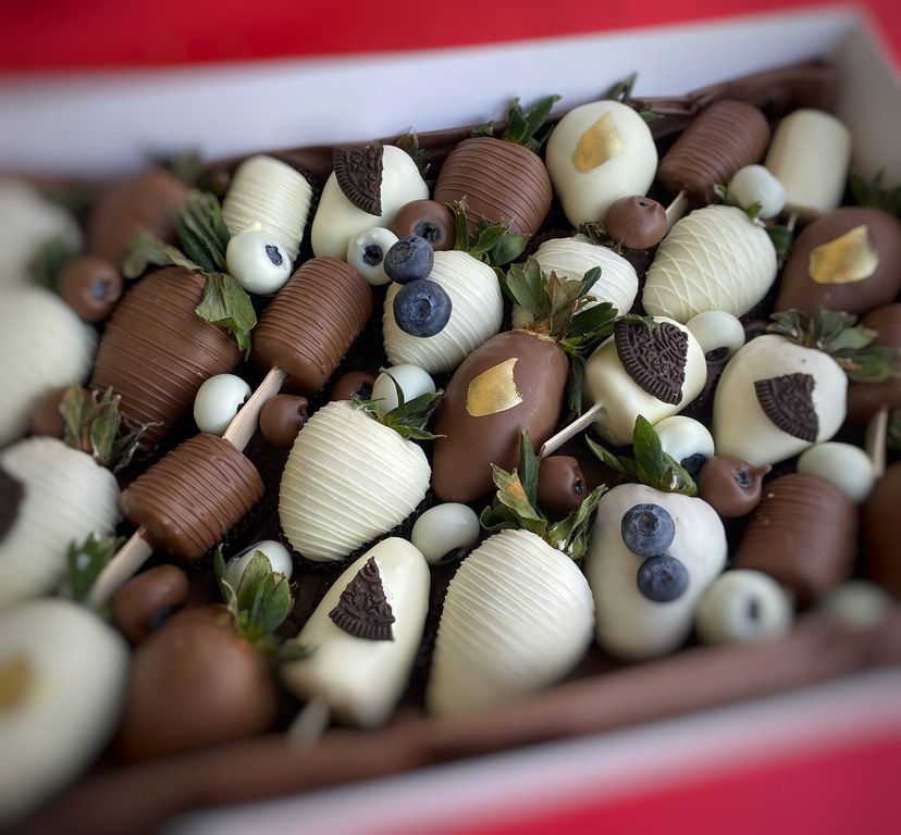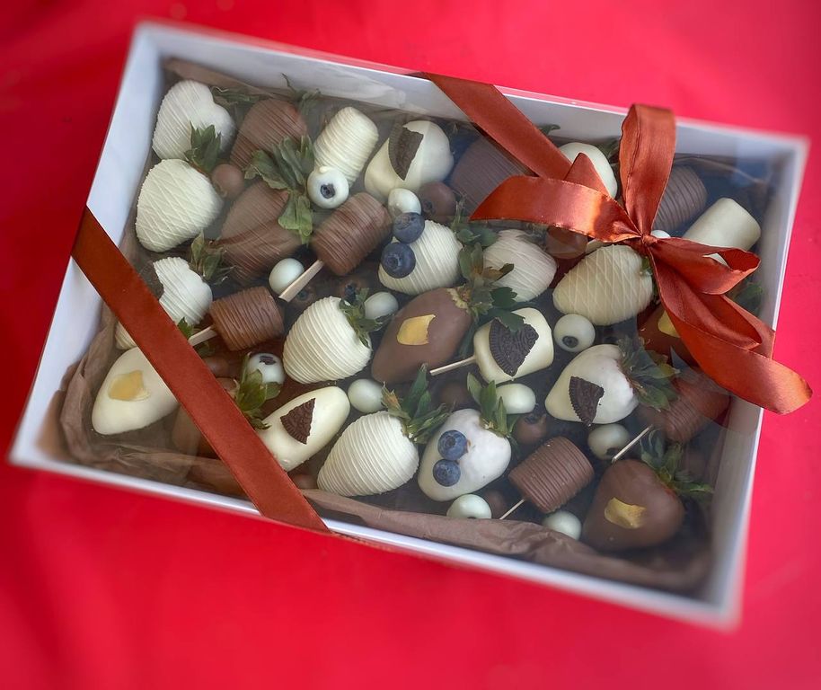 Коробка с клубникой, бананом и голубикой в белом и молочном шоколаде.