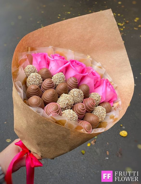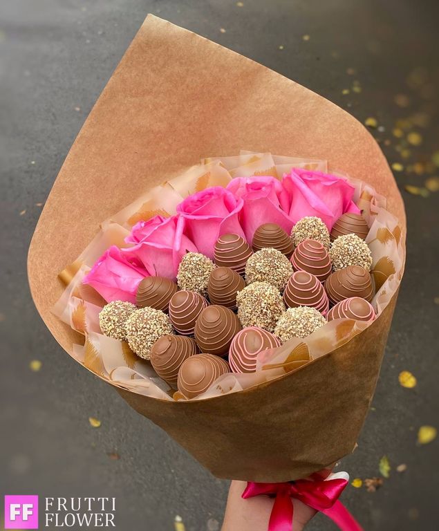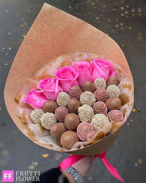 Очень нежный и в то же время яркий клубничный букет с 5-ю розочками.