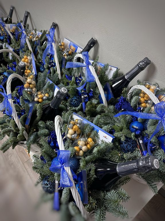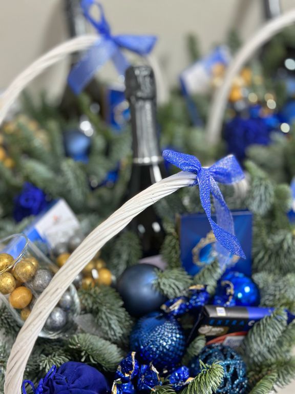 В данном варианте: шампанское, елочные украшения, шоколад, шоколадные конфеты, шоколадная плитка, мешочек с орехами и сухофруктами, 2 бокала для шампанского, арахис в шоколаде, нобилис (живая ель) для декора.