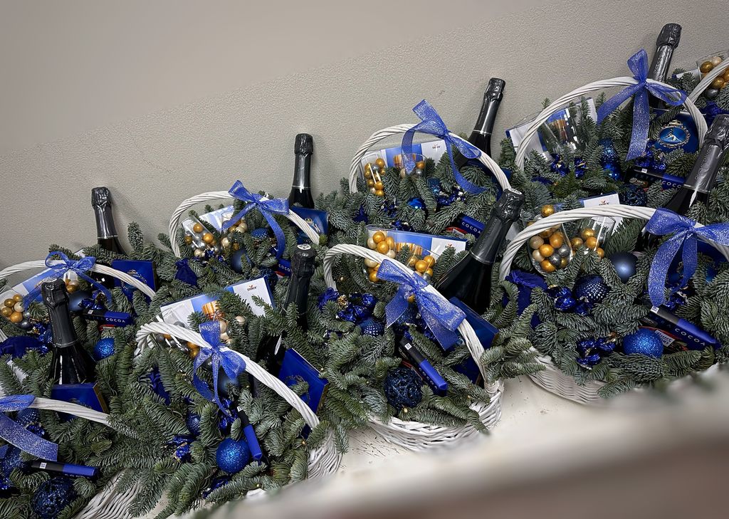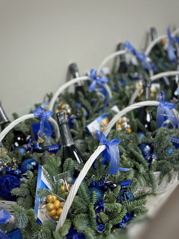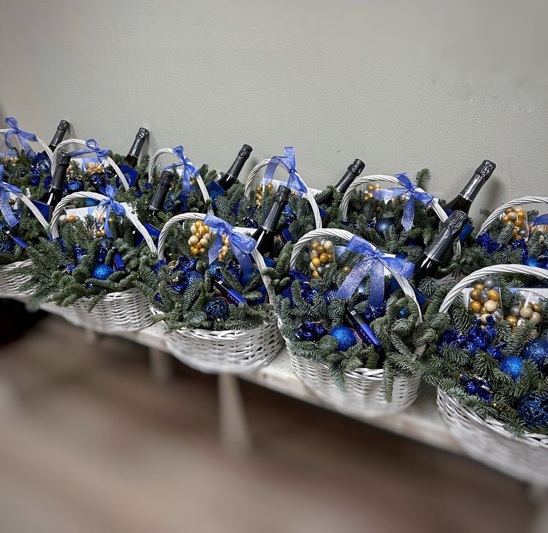 Новогодние тематические корзины, размер в собранном виде: 30 на 38 см.