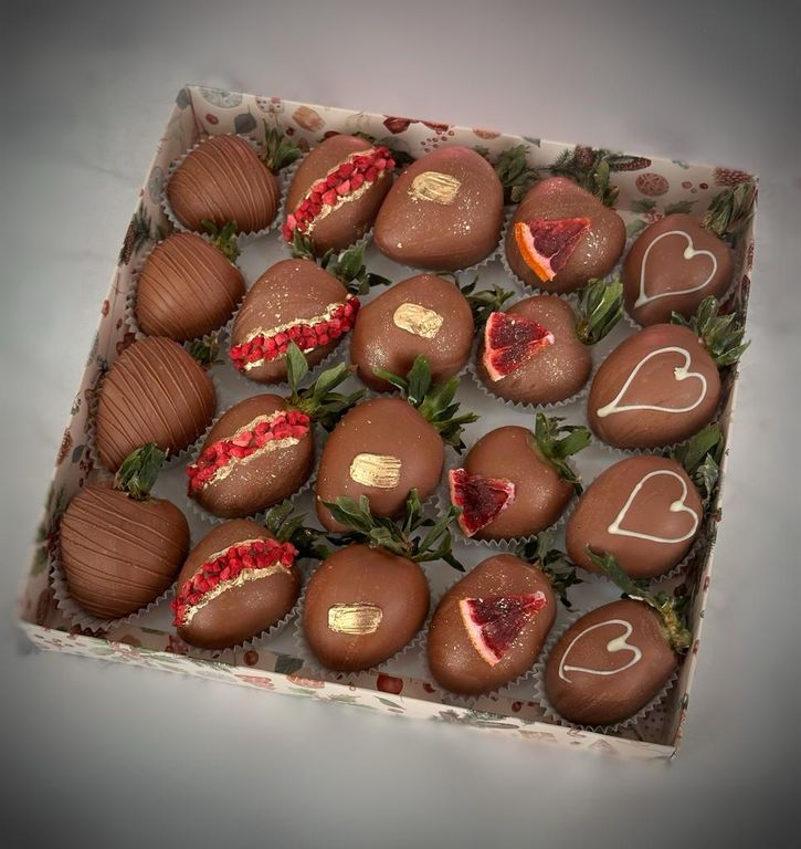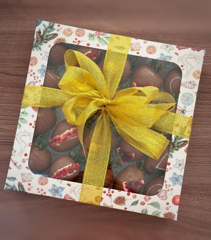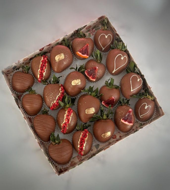 Коробка с клубникой в двойном шоколаде (белый и молочный), которая напоминает киндер-сюрприз.