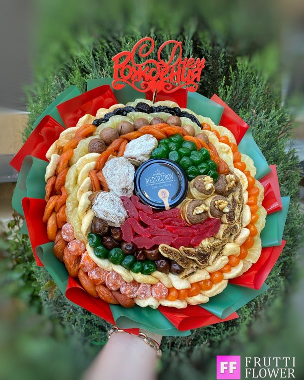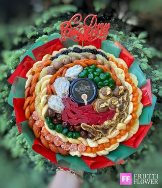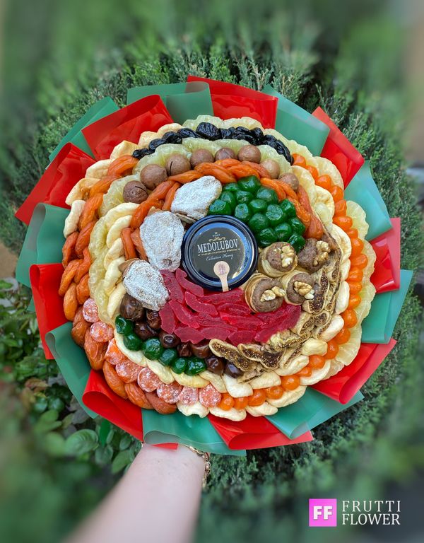 Прекрасный, яркий, насыщенный и разнообразный букет из сухофруктов. Диаметр: 32 см.